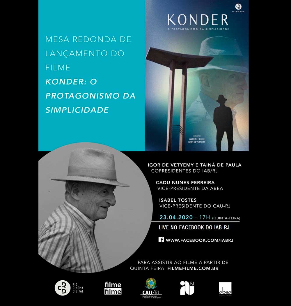 O IAB-RJ convida a todas e todos para o evento e lançamento do filme “Konder: o protagonismo da simplicidade”, sobre o grande Arquiteto, urbanista e professor, que foi presidente do IAB-RJ e autor de obras icônicas de nossa cidade. O filme, que é uma parceria do Instituto com a ABEA e o CAU-RJ, estaria estreando nos cinemas neste momento. Como demanda o atual contexto de isolamento social, no entanto, o lançamento ocorrerá em uma live na página do IAB-RJ no facebook, nesta quinta, 17h, com uma mesa redonda cheia de convidados especiais, que participam do filme. Estarão conosco Cadu Nunes-Ferreira, vice-presidente da ABEA, Isabel Tostes, vice-presidente do CAU-RJ e os copresidentes do IAB-RJ Tainá de Paula e Igor de Vetyemy (produtor, roteirista e diretor do filme, junto com Gabriel Melin). Quem quiser assistir ao filme, mesmo antes do evento virtual, ele já estará disponível desde a manhã de quinta-feira, na plataforma filmefilme.com.br